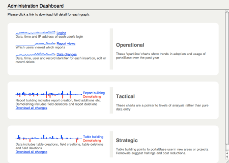 To go with the recent work on visualisation of utilisation data involving treemaps, we’ve added another tool to the portalBase manager/admin’s arsenal – ‘sparkline’ graphs that use log statistics to highlight particular types of usage in three areas – operational, tactical and strategic.