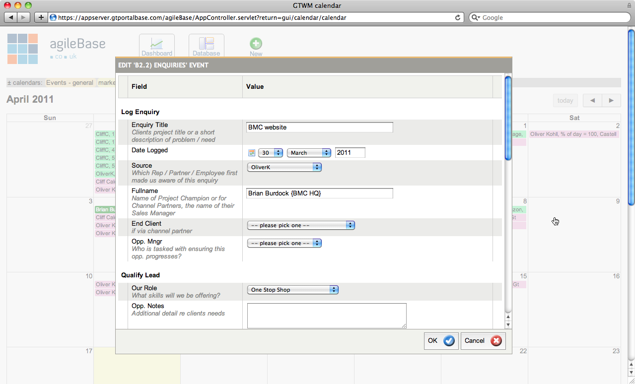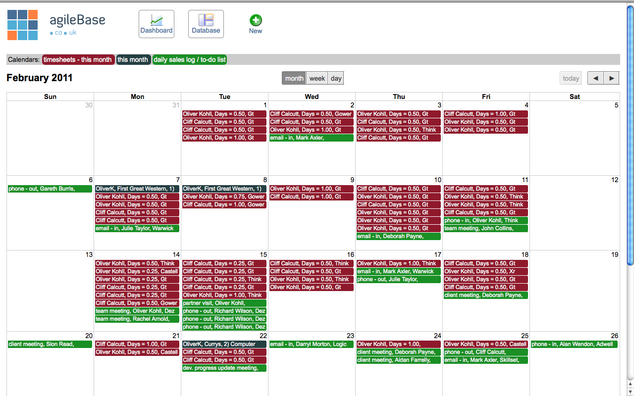In previous posts we talked about the integration of agileBase with Google calendars, an option which is still available. However this month we’re launching a new vastly improved integrated calendar which not only allows you to display data (as google does) but allows you to update the database from the calendar interface.