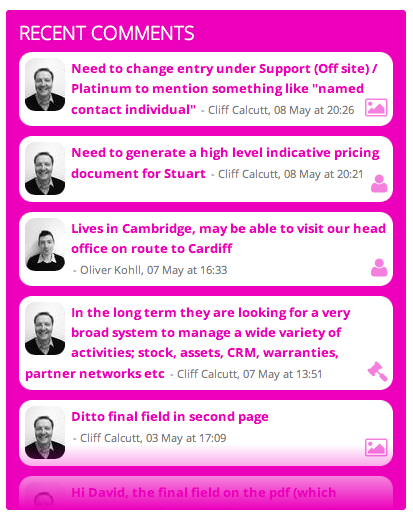 The comment field has proved one of the most popular features ever introduced to Agilebase. For those unfamiliar, comments let staff add ad-hoc comments and notes to company information, building up conversations, for example to discuss a sales opportunity or project.