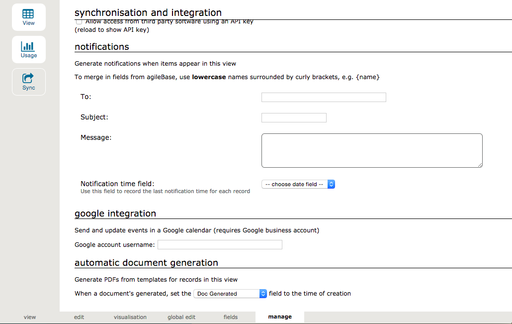 - In the manage tab for the view, click the ‘sync’ button and scroll down to ‘automatic document generation’. Select the date field that you created in step 2 above, i.e. ‘document generation time’