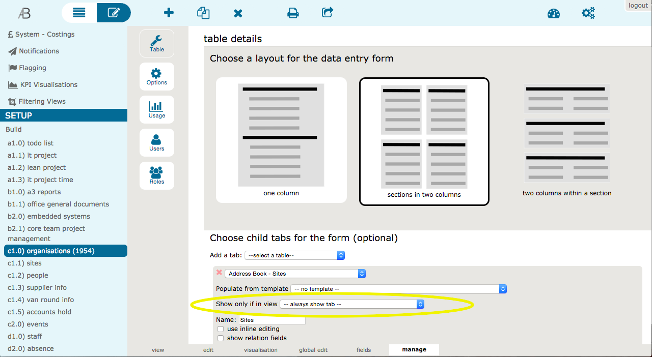 - in the table’s manage tab, in the setup block for the tab you want to show hide, select this view for the ‘show only if in view’ option