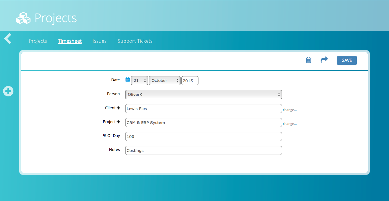 In this screenshot of a timesheet record, clicking an arrow next to client or project will jump to the full record so it can be updated.