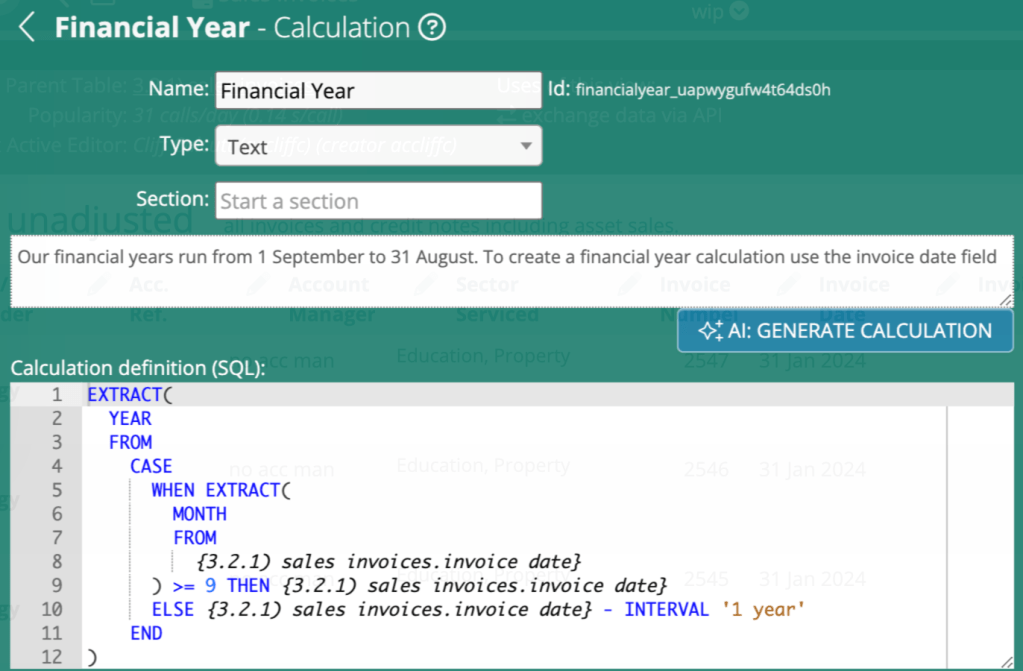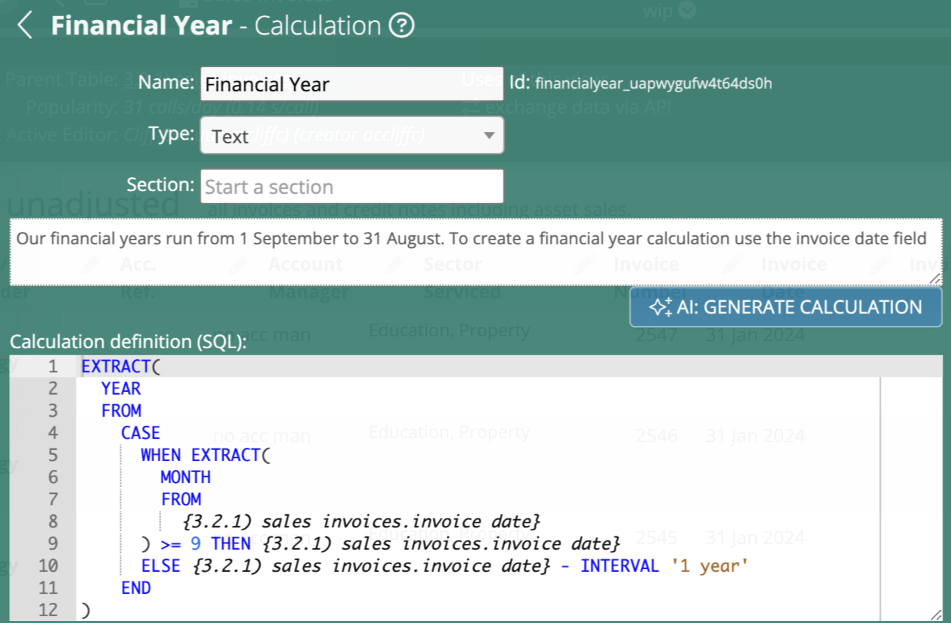 2. The AI can now create calculations which will be a game changer for people who don’t know SQL. The goal of Agilebase No Code is to empower non-technical people so this fits right in. Please note that the AI might not always get them right! It’s not perfect, however it should be a good learning tool.